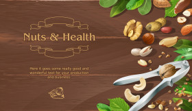 A clean and natural banner design featuring a mix of raw nuts on a rustic wooden background.