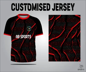 High-quality black and red textured sublimation jersey vector. Features abstract wavy lines and dot patterns for a modern, aggressive sports look.