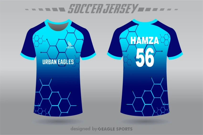 Stylish teal blue sublimation jersey featuring dynamic red paint splashes, sharp white diagonal lines, and creative textured hexagon patterns.